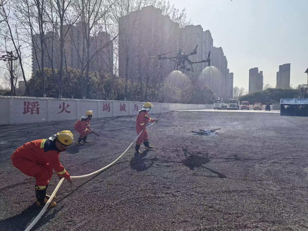 演练现场,救援人员迅速搭建起应急帐篷,成立临时指挥部,确保救援指挥体系高效、顺畅运转。指令下达后,各救援队伍闻令而动,快速集结,分工明确,配合默契。多架无人机率先升空,一方面开展空中侦察,实时回传火场态势画面,为指挥决策提供精准依据;另一方面,精准喷洒灭火水源,对高处明火及隐蔽火点进行远程压制,细密的水幕精准覆盖火点,有效遏制了火情的进一步扩散。